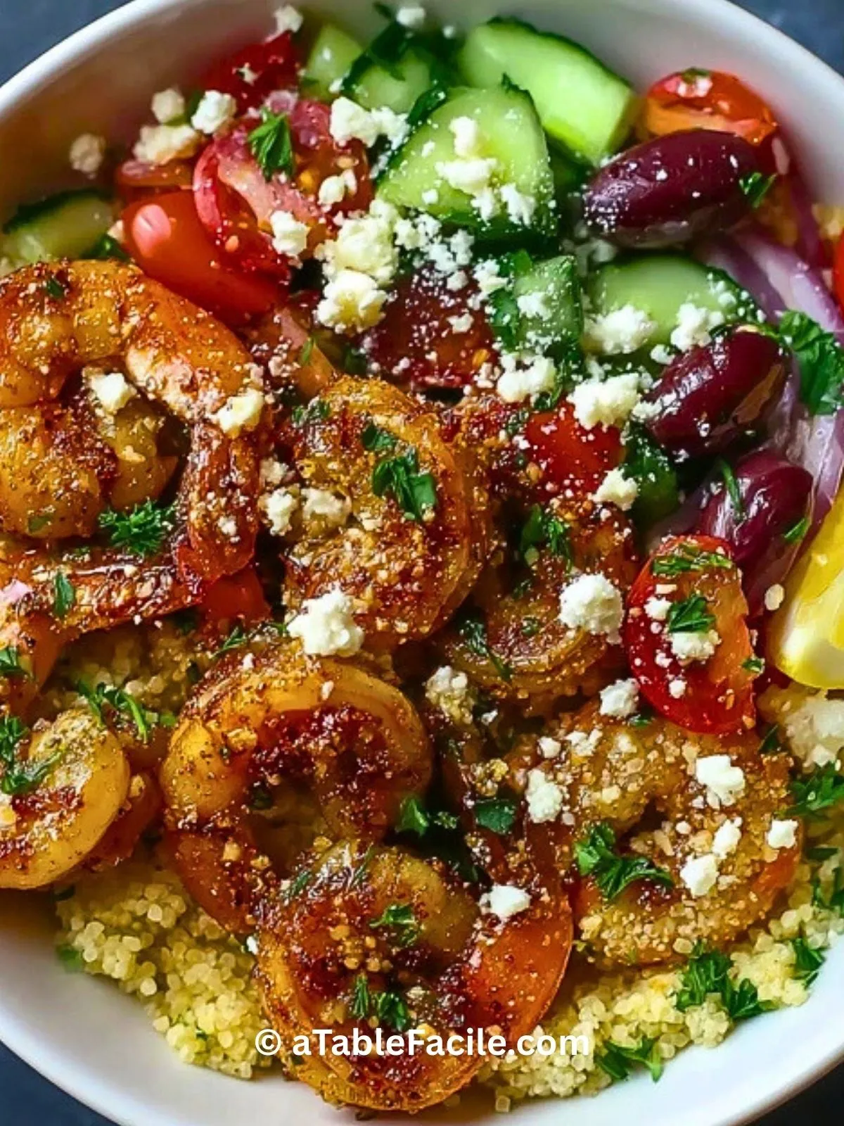 Keywords: crevettes, bol méditerranéen, recette rapide, quinoa, légumes frais
