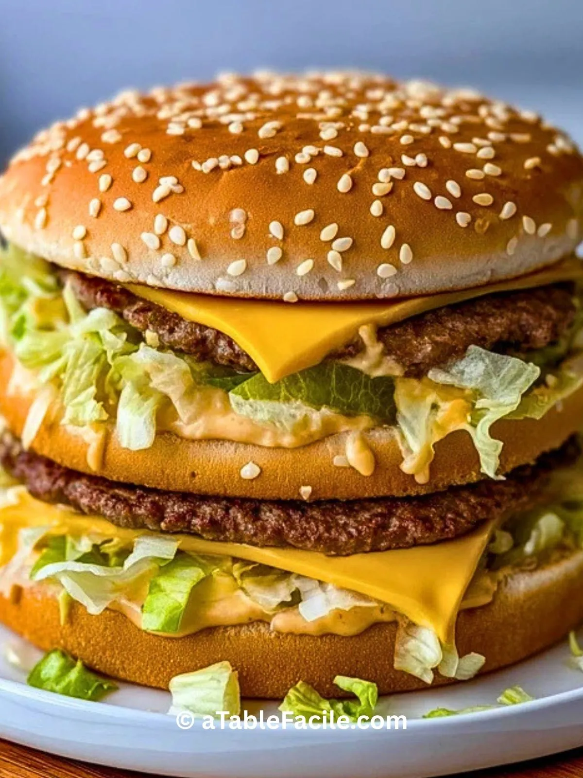 Ce burger géant style Big Mac est la preuve qu’on peut faire mieux que le fast-food à la maison, avec des produits simples et une bonne dose d’amour. Idéal pour une soirée burger en famille ou entre amis !