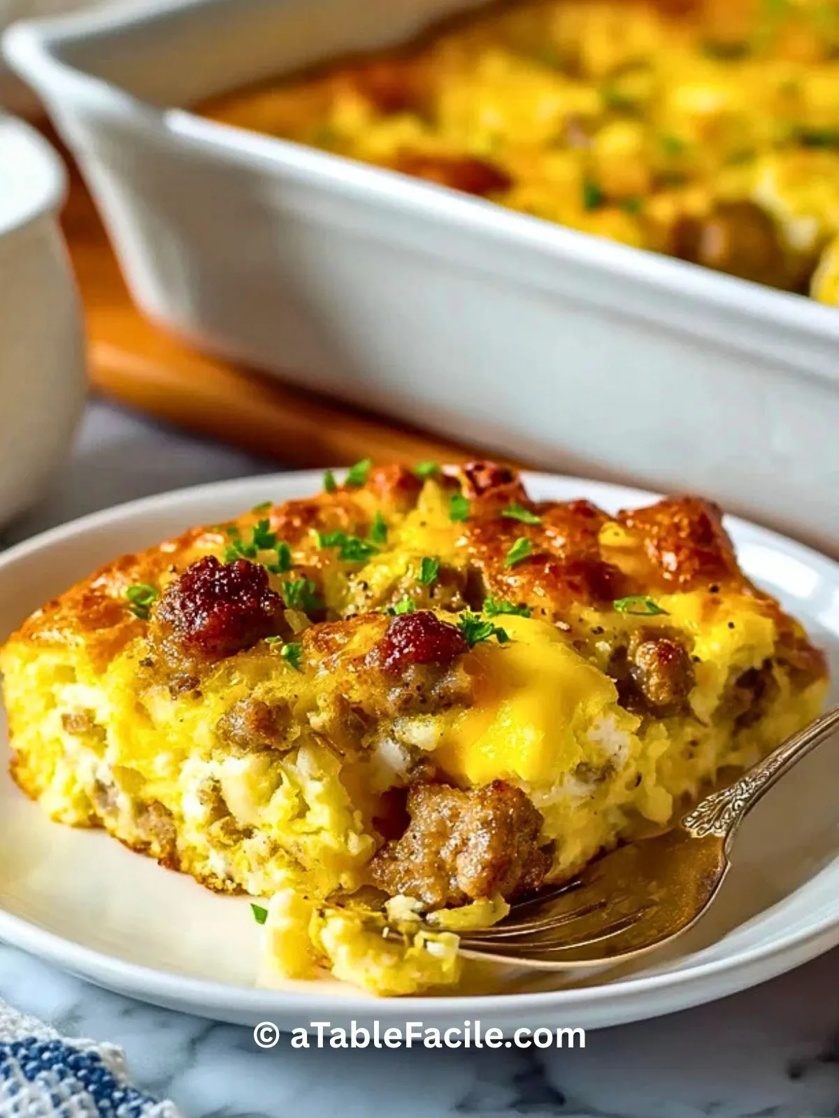 Casserole de petit-déjeuner moelleuse et gourmande, préparée avec des saucisses dorées, du pain de mie, du cheddar fondant et des œufs. Un plat complet à préparer la veille, parfait pour un brunch convivial ou un matin de fête, à partager en famille ou entre amis.