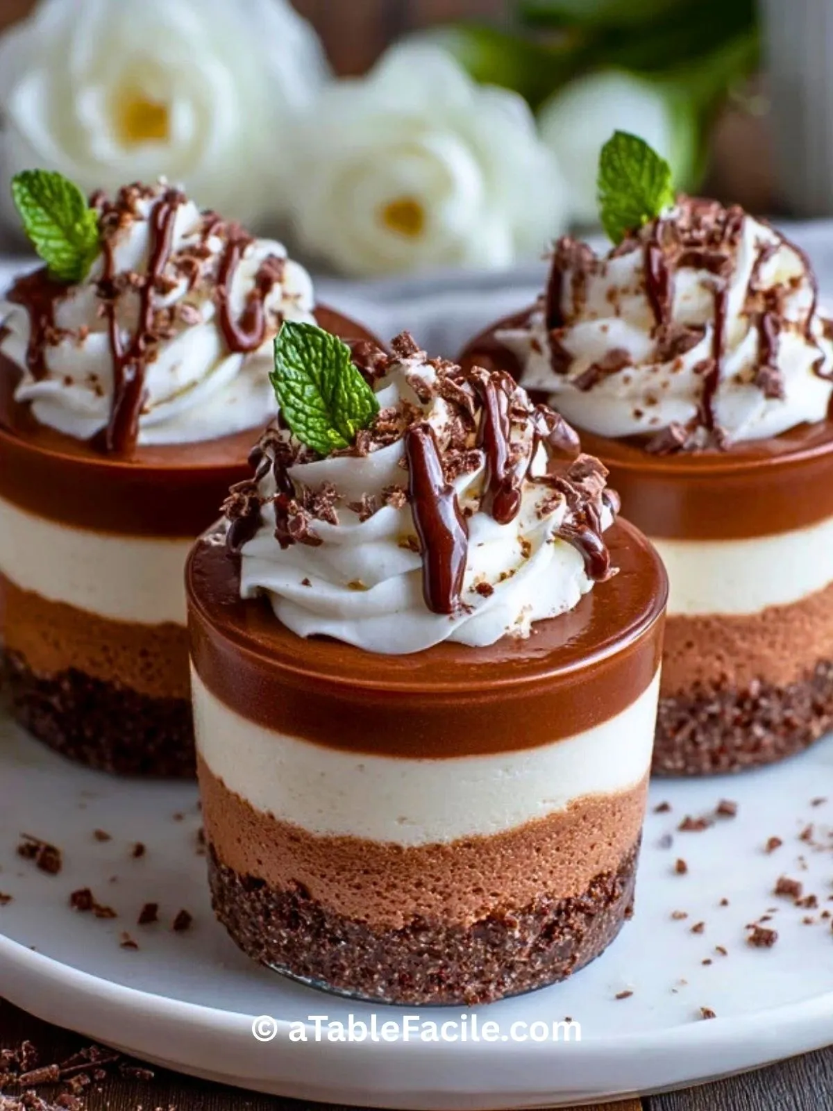 Ce que j’aime dans cette recette, c’est le contraste entre les couches : une mousse légère au chocolat noir, une onctueuse au lait et une dernière toute douce au chocolat blanc. Présentées en coupes individuelles, elles sont aussi belles que savoureuses.