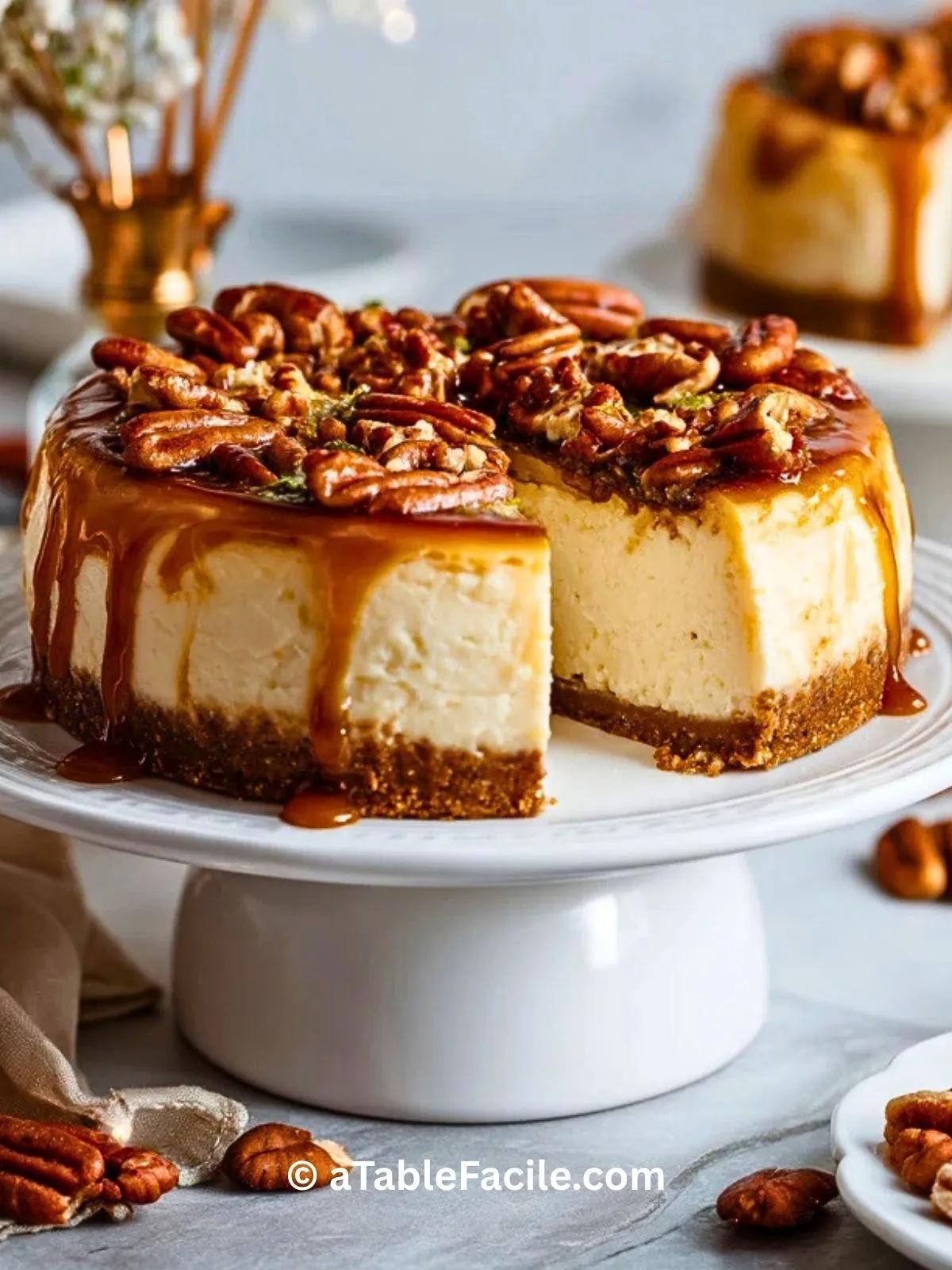 Cheesecake ultra crémeux avec une base croquante et des noix de pécan caramélisées, parfait pour les fêtes ou un dessert raffiné fait maison.