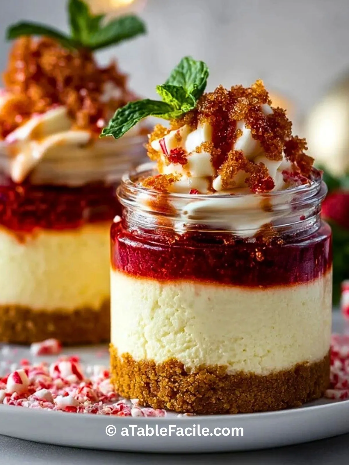 Parfaits de cheesecake à la canne en sucre : un dessert festif sans cuisson, associant une base de biscuits croustillants, une crème onctueuse et des éclats de sucre d’orge. Parfait pour les fêtes ou un goûter chic.