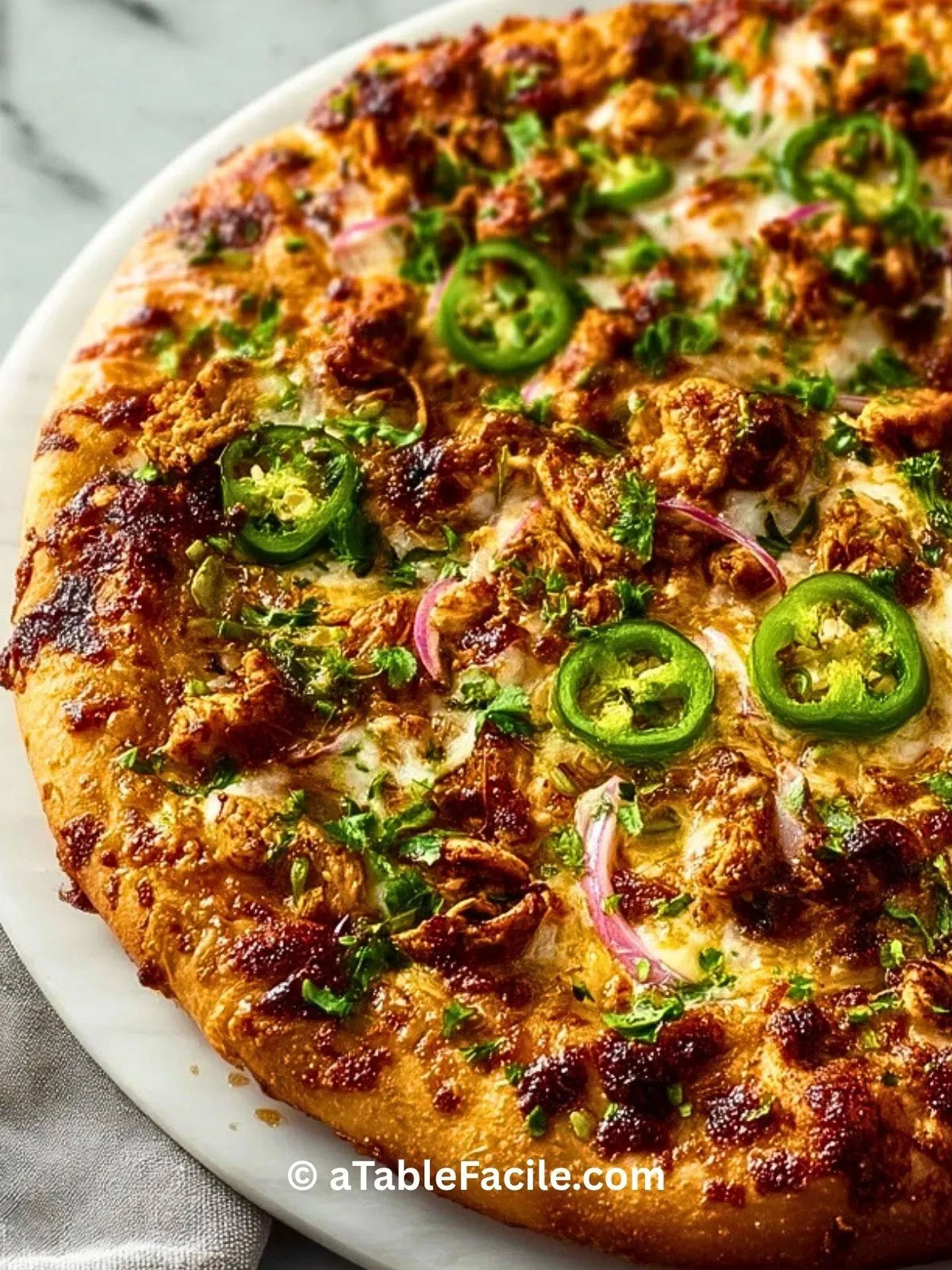 J’ai toujours eu un faible pour les pizzas maison, surtout celles qui sortent de l’ordinaire. Cette pizza au poulet épicé aux jalapeños marinés est rapidement devenue l’une de mes préférées. Elle combine le piquant du piment, la tendreté du poulet et la gourmandise du fromage fondu sur une pâte croustillante. C’est un pur bonheur à chaque bouchée.