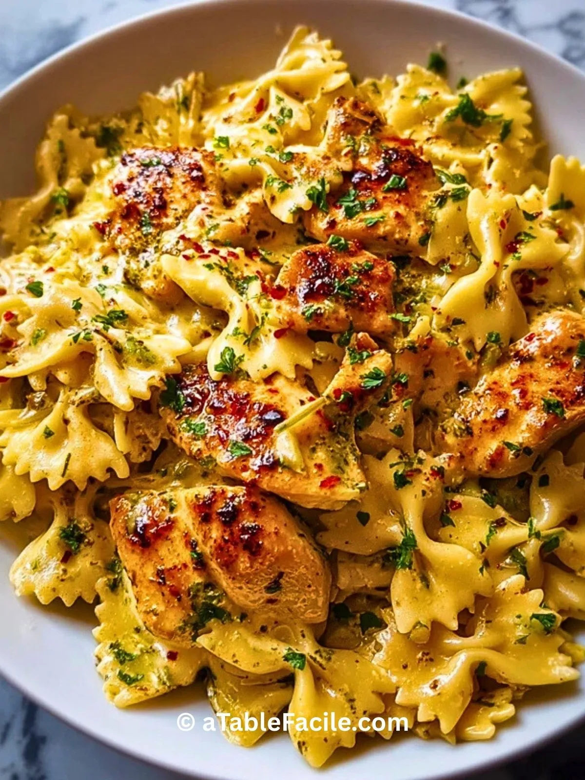 Mélangez délicatement les farfalles avec la sauce crémeuse et le poulet grillé. Servez bien chaud, parsemé de persil frais et d’un peu de parmesan râpé si vous aimez.