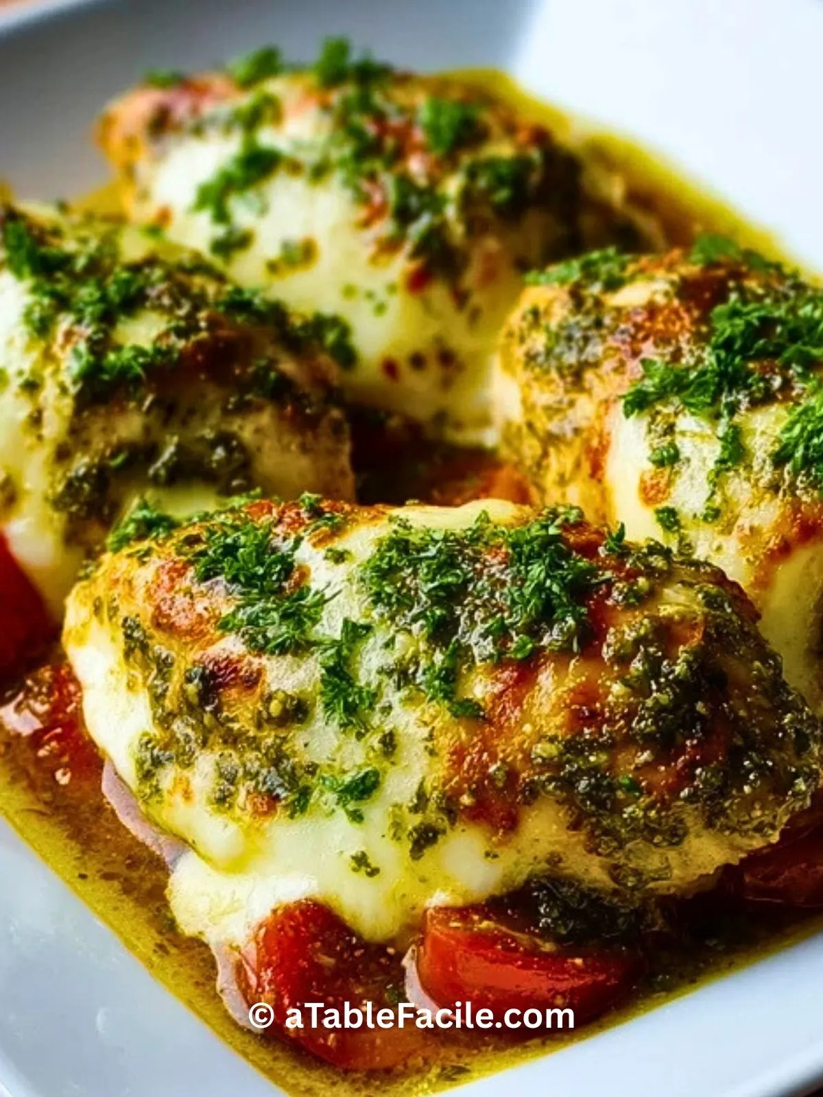Poulet au four ultra moelleux nappé de pesto et gratiné à la mozzarella, accompagné de tomates cerises rôties. Un plat express, savoureux et convivial, parfait pour toute la famille !