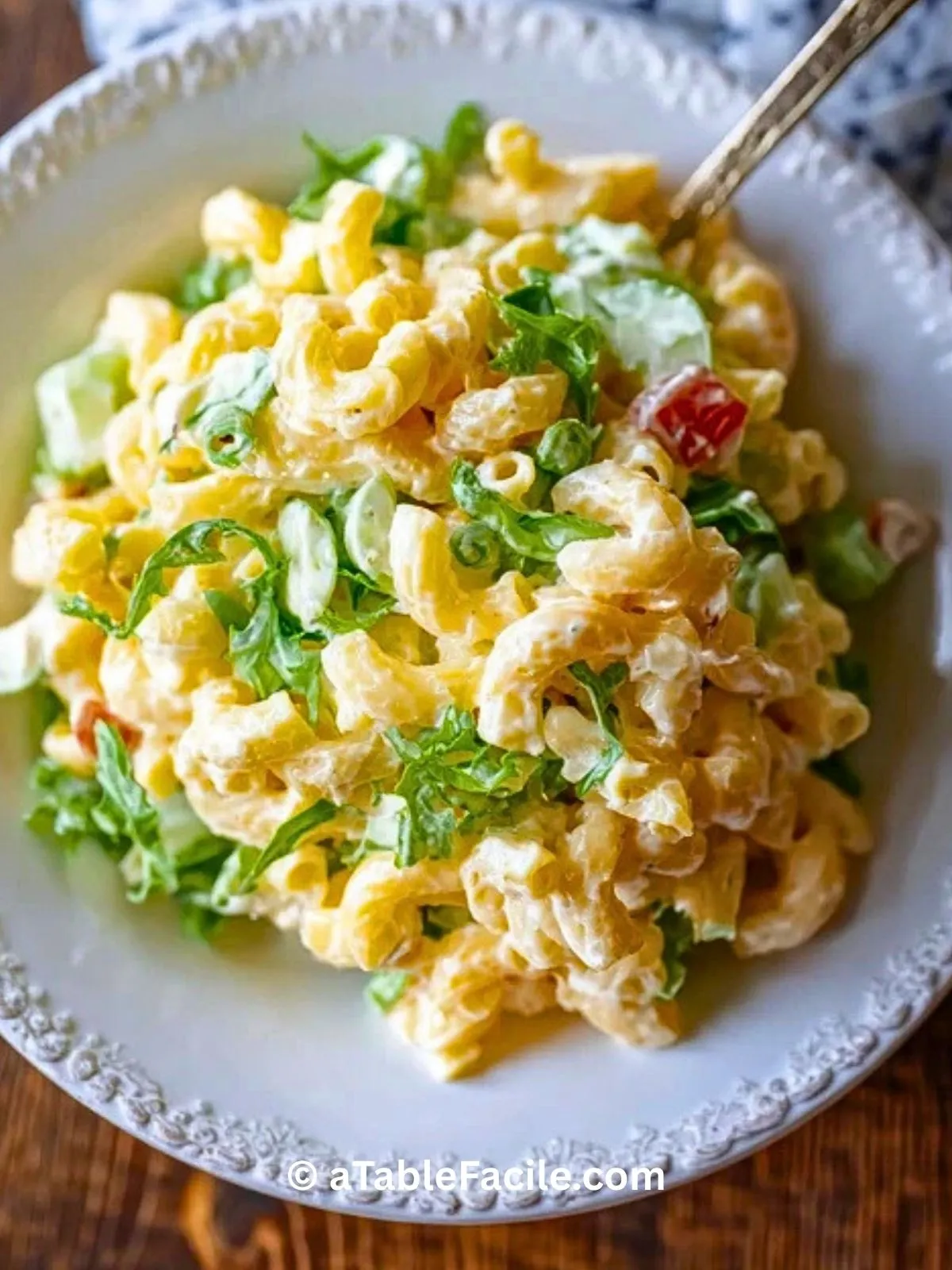 Cette recette est ultra gourmande et pleine de fraîcheur : le mélange de mayonnaise, de moutarde douce, de légumes et de petites pâtes crée un équilibre parfait. Elle est personnalisable selon vos envies : vous pouvez ajouter du fromage, du jambon ou la rendre 100 % veggie. Et elle est inratable, même pour les débutants en cuisine !