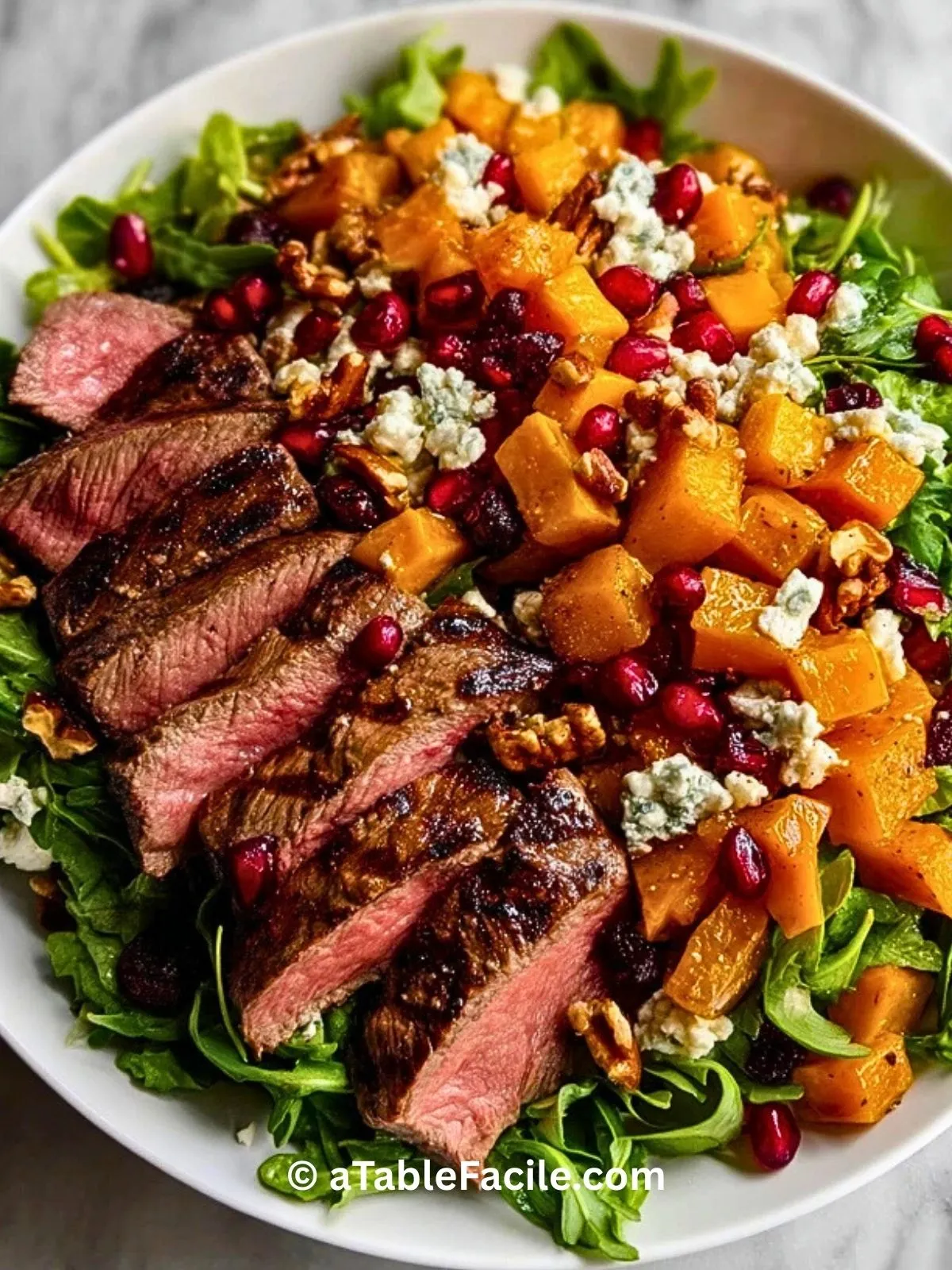 Ce que j’adore dans cette salade, c’est qu’elle est à la fois copieuse et légère. On y retrouve la chaleur d’un steak parfaitement cuit, la tendresse de la courge rôtie, le croquant des noix et la petite acidité du fromage bleu et des graines de grenade. C’est un vrai bonheur à chaque bouchée, parfait pour un repas complet et sain.
