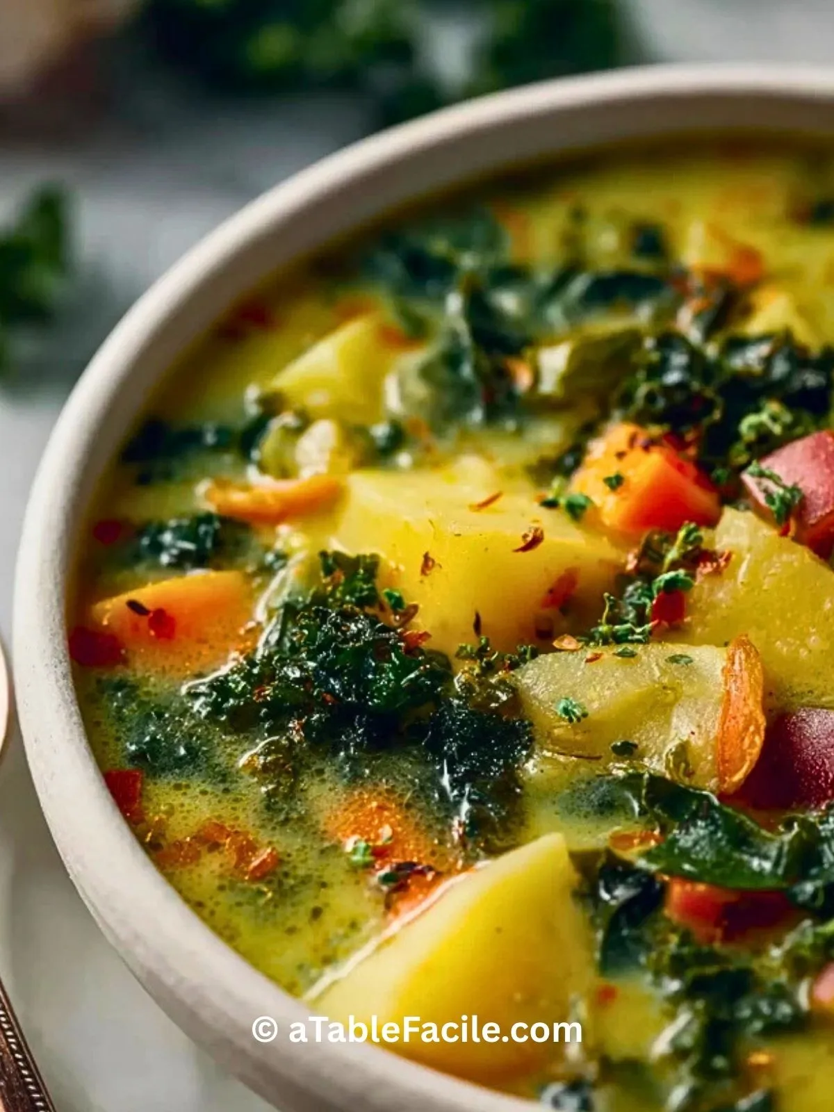 Si cette soupe épaissie aux pommes de terre et au chou frisé t’a plu, pense à l’enregistrer sur Pinterest et à la partager avec ta famille ou tes amis gourmands. Rien de plus convivial qu’un bon bol de soupe partagé à la maison !