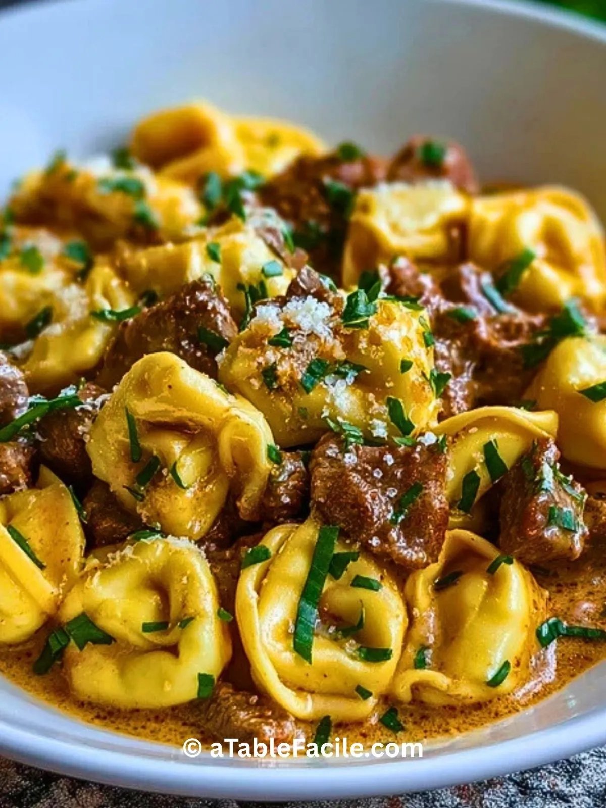 Keywords: tortellini, cheesesteak, gratin, pâtes crémeuses, plat familial, recette facile