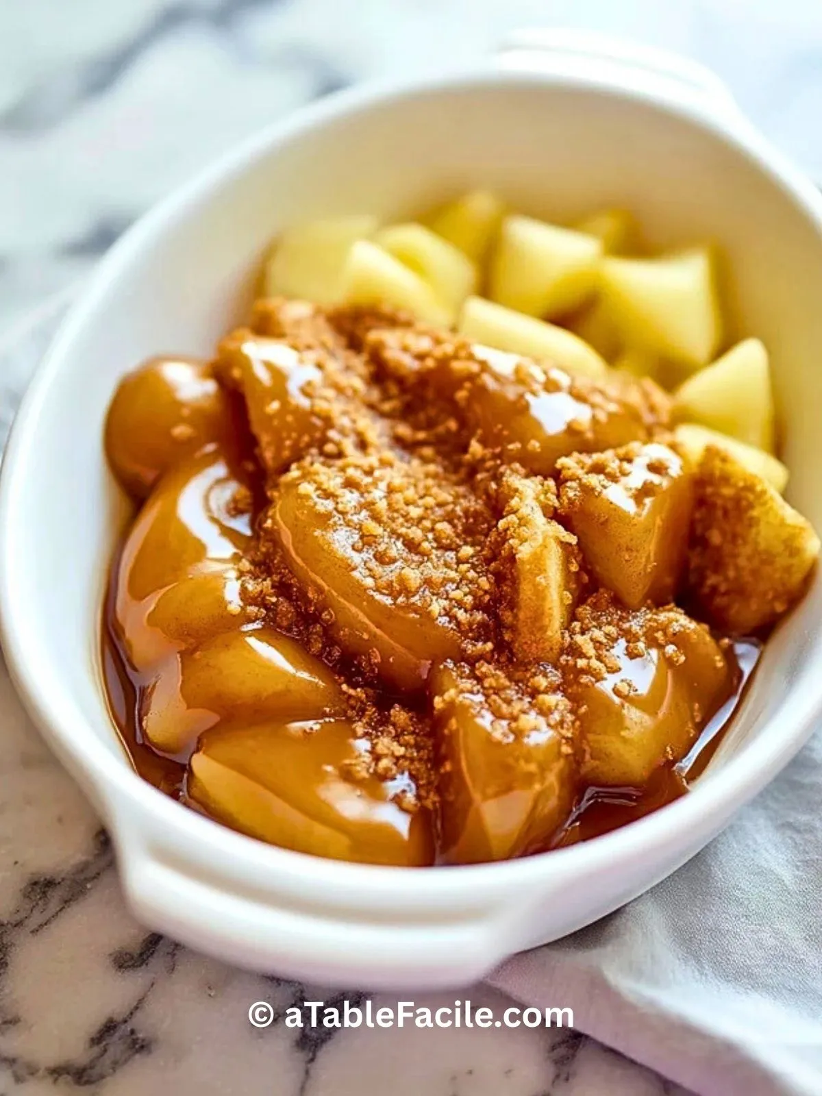 Cette trempette est ultra réconfortante, facile à préparer et ne demande que quelques ingrédients simples. La douceur des pommes fondantes se marie parfaitement avec le caramel maison, et le croustillant du crumble par-dessus apporte la touche finale. C’est aussi une excellente idée pour utiliser des pommes un peu abîmées. Impossible de résister à cette alliance de textures et de saveurs !